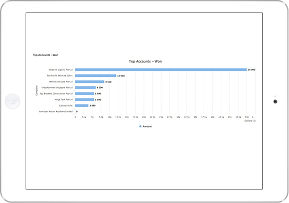 Biểu đồ thanh này cho phép tóm tắt nhanh chóng những nhân viên chốt giao dịch thành công hàng đầu của công ty bạn cũng như các nhân viên giành giao dịch giá trị cao nhất. Đối với tính toán tiền thưởng cũng như sự vững mạnh của đội ngũ kinh doanh của công ty, bản tóm tắt này đóng vai trò như một chỉ số giá trị cho việc định hướng KPI