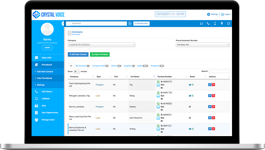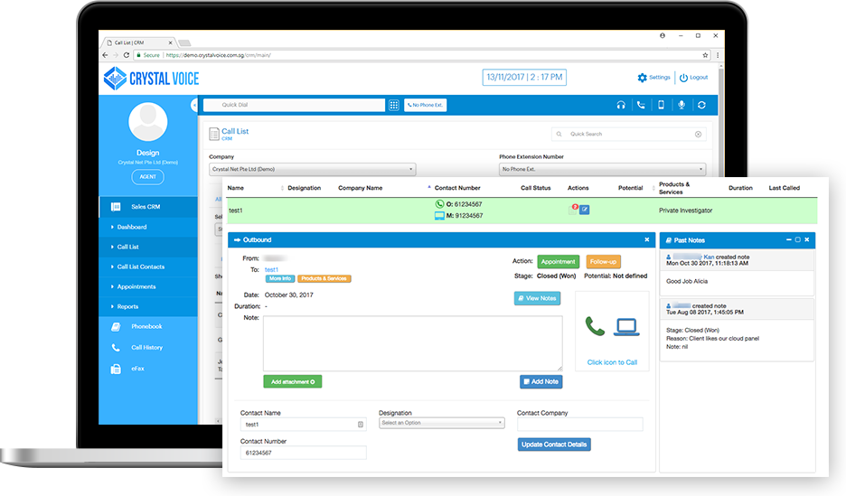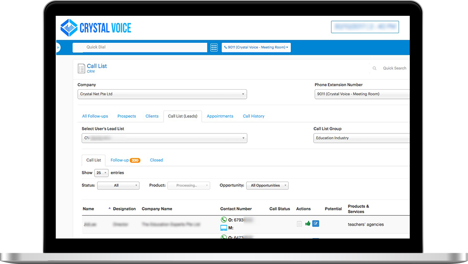Crystal Dash CRM là CRM duy nhất trên thị trường, cho phép người dùng không chỉ có chi tiết hoạt động bán hàng sau khi hoàn thành, nó còn cho phép tích hợp VoIP để người dùng trải nghiệm các hoạt động cuộc gọi tích hợp cũng như lịch sử cuộc gọi gắn liền với chính Bảng điều khiển đám mây.