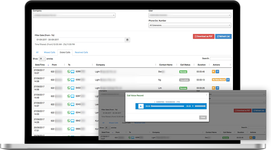 Với hệ thống đám mây của chúng tôi, công ty của bạn có thể theo dõi và ghi âm các cuộc gọi. Như vậy, nếu bạn cần theo dõi hiệu suất hoạt động của công ty, bạn chỉ cần đến tính năng báo cáo cuộc gọi để xem tất cả các chi tiết quan trọng.